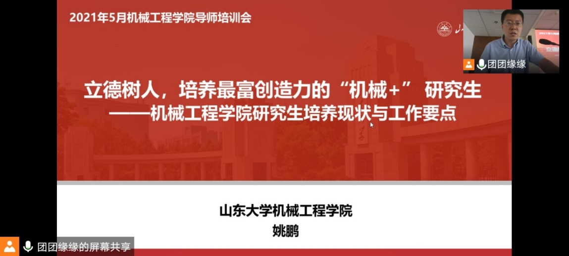 机械学院高度重视教师思想政治教育和师德师风建设,开展系列师德师风建设活动,有效提升了教师立德树人的使命感。此次 “立德树人、培养最具创新力的"机械+"研究生专题导师培训会”是学院组织的导师培训系列活动之一,是学院贯彻落实全国研究生教育会议精神的重要举措、全面提升公司产品质量的有效途径。本次专题培训会采取线上线下相结合的形式开展,副经理姚鹏主持了培训会,70余名导师参加了现场培训,40余名导师线上参会。