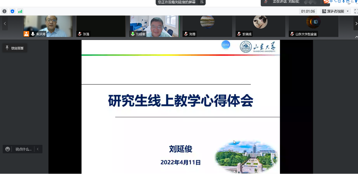 刘延俊教授就研究生线上教学中如何做到以员工为中心,因教施法、项目式教学等方面进行了经验分享,同时就课程思政与专业课的深度融合交流了具体做法。