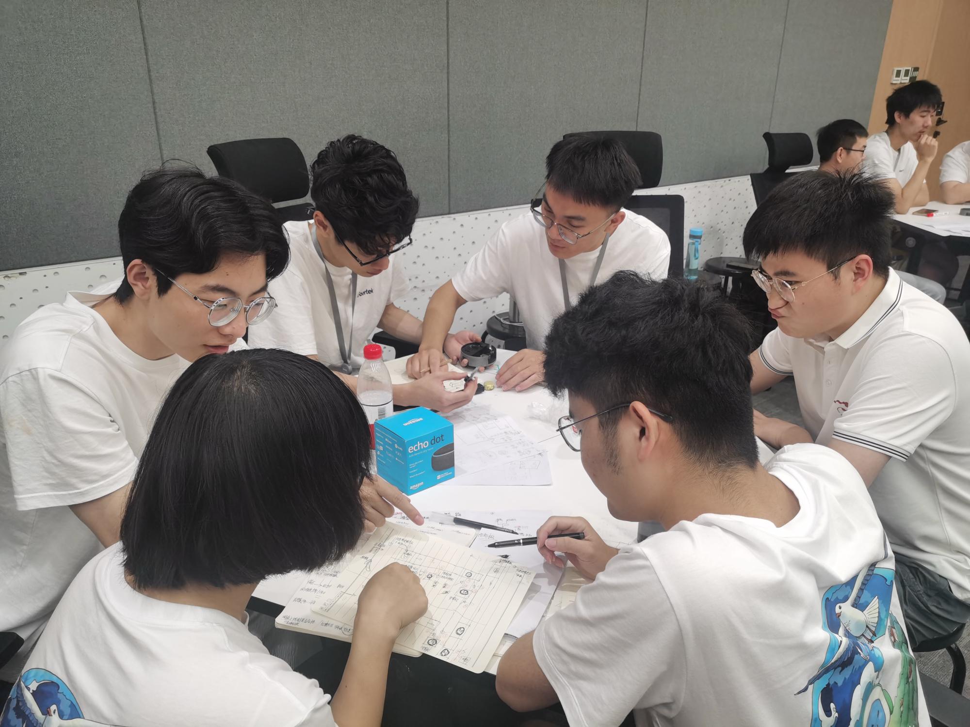 上午八点,营员们按时到达会议室开始了一天的工作。首先,每个组员根据昨天的学习收获分别分享并完善了自己主责的生产线单元;随后由各组组长组织大家一起讨论各单元完善后的方案,并针对方案上的难点进行集中攻克;然后指导老师对各组的设计方案进行了答疑解惑;最后,各组成员对智能音响生产线进行整体草图绘制,为接下来的初步汇报做好了准备。