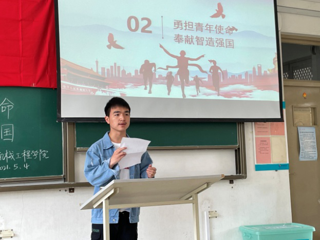 随后,代表同学进行了“勇担青年使命,奉献制造强国”的主题分享。17级代表同学从未来展望出发,结合自己本科生毕业后发展方向,表明青年应当勇担强国担当,助力国家制造业发展。18级代表同学主要就如何找准自身定位、看清前进道路进行分享与展望,他们表示作为新时代青年,同学们应当发现自我、找到自我、坚持自我,为国家、为民族奉献属于青春力量。19级代表同学结合国家“十四五规划”,表示作为当代青年,机械学子们应当夯实学科基础,努力学习制造相关知识,加快国家制造业发展。20级代表同学结合自身发展规划,分享了自己老员工活的心路历程,与在场同学共勉:为国家强大、民族昌盛而不懈奋斗。本次重温入团誓词活动在团歌声中结束。